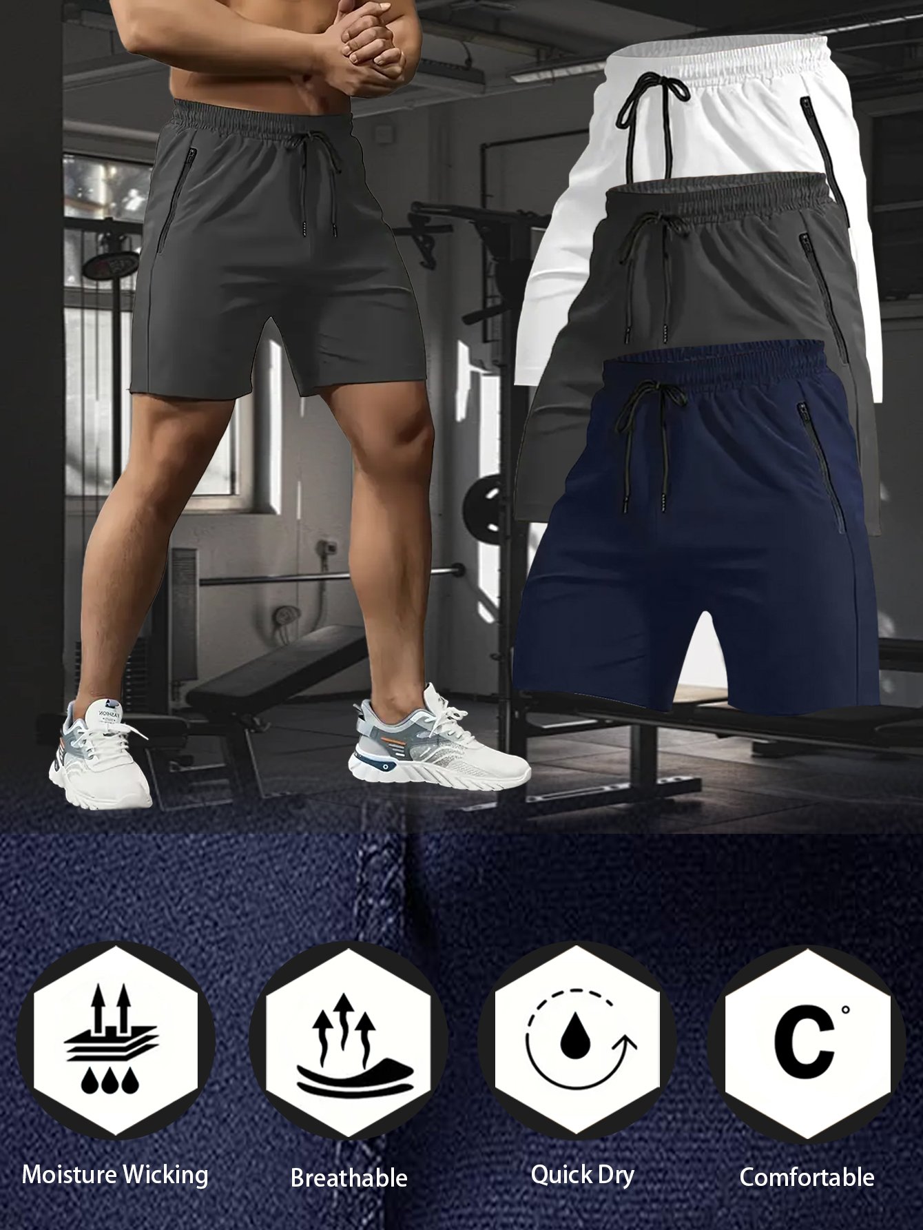 3 pairs of men’s lightweight sports shorts for gym workouts, exercise, running, and jogging. These quick-drying shorts feature zippered pockets.